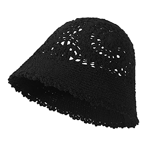 ZLYC Donne Estate Crochet Knit Bucket Hat Cotone Handmade Floreale Cappelli, Nero tinta unita., Taglia unica