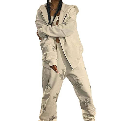 Donne Zip Up Felpe Oversize Y2k Estetica Croce Strass Con Cappuccio Pullover 90s Vintage Giacca Felpe Streetwear, bianco, M