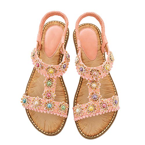 Donne Sandali con Strass della Boemia Sandali T-Strap Beaded Gladiatore Gladiatore Abito Piatto Sandali Spiaggia Summer Beach Casual Scarpe comode,Rosa,40
