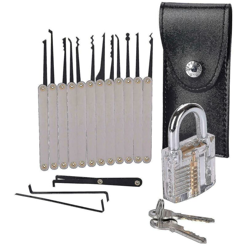Set di grimaldelli di sblocco Estrattore di chiavi Strumento di lucchetto trasparente per esercitazioni Il pacchetto include: 12 x vari plettri 3 x chiavi di tensione1 x custodia per il trasporto 1 x lucchetto completamente funzionante al 100%