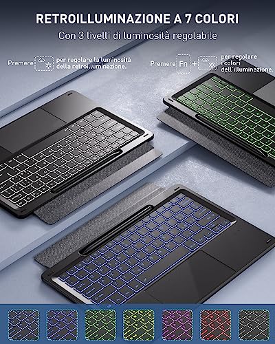 TASTIERA ILLUMINATA E RICARICABILE PER GALAXY TAB: la tastiera multifunzione è dotata di retroilluminazione a 7 colori e luminosità a 3 livelli. Con una grande capacità di 650 mAh, la tastiera consente un tempo di lavoro continuo fino a 220 ore senza illuminazione, 6 ore con illuminazione, ricarica con cavo USB C.