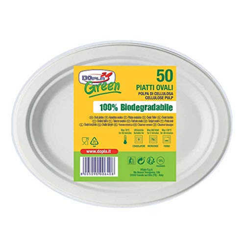 I piatti ovali Dopla Green sono realizzati in polpa di cellulosa, un materiale di origine vegetale realizzato con fibre residue derivanti dalla lavorazione del legno, sono biodegradabili al 100%. Terminato l'uso possono quindi essere conferiti direttamente nella frazione umida, assieme agli avanzi, nel rispetto delle disposizioni dettate dal comune di appartenenza