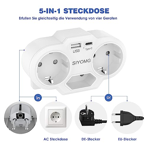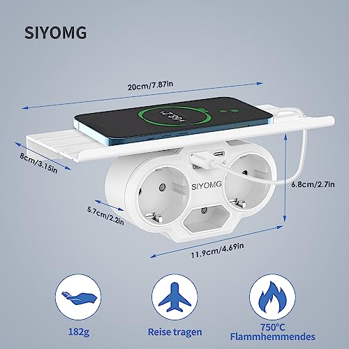 Doppia spina per presa, SIYOMG Presa USB da parete con 1 porta USB C + 1 tipo A USB + 3 Schuko prese AC, Spina Multipla per l'ufficio di viaggio Domestico con Mensola.