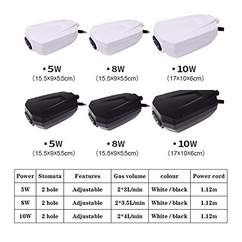 Doppia Uscita Bianco/Nero Acquario Pompa D'aria, Ultra-Quiet Fish Tank Aeratore Regolabile Compressore D'aria Con Gas in Pietra Tubo Valvola Di Ritegno,Nero,5W