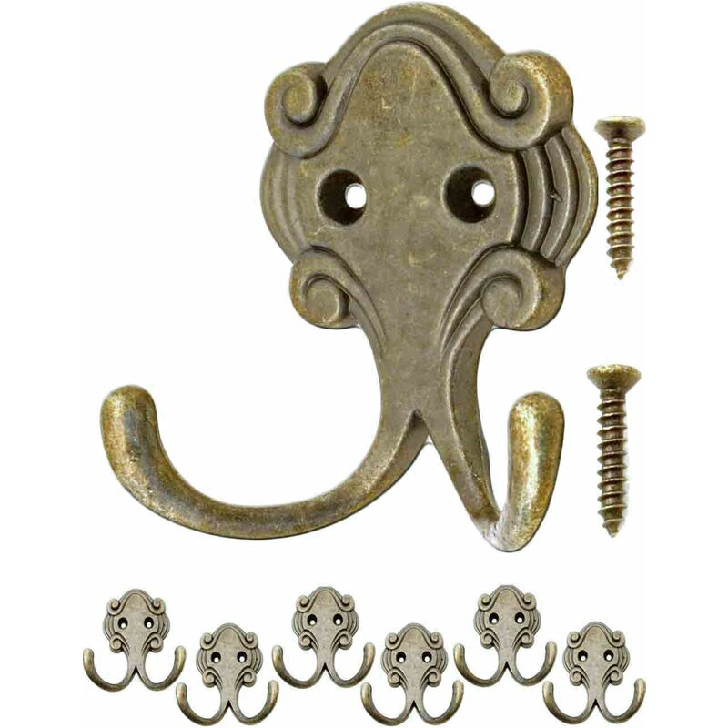 Design antico, design vintage, design casa di campagna, design vintage, design casa di campagnaSet di 6 ganci per armadi, vestiti, asciugamani, mensole, armadi, ante, ecc. ottone anticato fuso, aspetto bronzo Gancio doppio curvo/gancio doppio con vintage dettagli di stile Dimensioni circa 5,7 cm di altezza, circa 5,3 cm di larghezza, distanza tra i fori 15 mm, dotazione di fornitura: 6 ganci + 12 viti abbinate