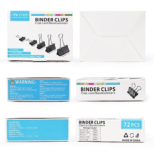 Clip Doppio - MAIKEHIGH 72 Pezzi FoldBack Binder Clips Carta per metallo Binder Clamps per Note Letter Paper Clip Office Supplies, 5 formati assortiti, Nero