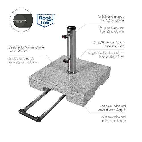 Questa moderna base trolley in granito grigio chiaro è perfetta per il vostro ombrellone con un diametro fino a 350 cm.