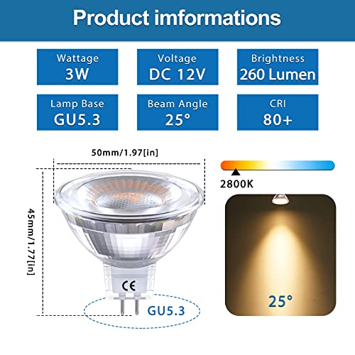 Lampadine a LED GU5.3: lampadine a LED 12V 3W MR16 GU5.3 non dimmerabili, bianco caldo 3000K, ingresso DC 12V, angolo del fascio di 25°. Faretti LED GU5.3 senza sfarfallio.