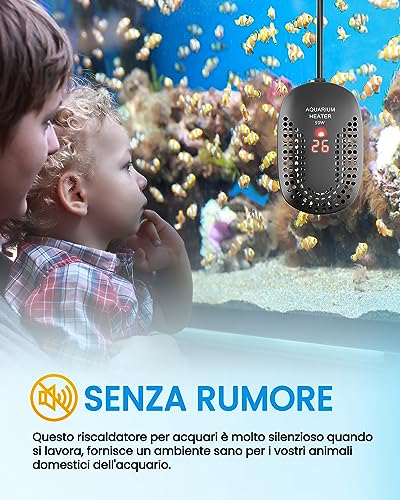 [Protezione Intelligente da Sovratemperatura]: Questo riscaldatore per acquario ha un sistema di controllo della temperatura intelligente. Si spegne automaticamente quando la temperatura supera il limite impostato e riprende a riscaldare quando scende al di sotto della temperatura desiderata. Inoltre, si spegne automaticamente quando è fuori dall'acqua, garantendo massima sicurezza per te e i tuoi organismi acquatici.