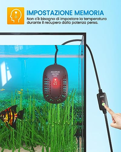 [Display Digitale a LED]: Questo riscaldatore per acquario ha un display digitale situato sul fronte. Durante il riscaldamento, una spia rossa sopra le cifre si accende, mentre si spegne quando il riscaldamento si interrompe. Il termometro incorporato mostra in modo continuo la temperatura dell'acqua sullo schermo LED. La memorizzazione dell'impostazione della temperatura elimina la necessità di reinserirla dopo lo spegnimento.
