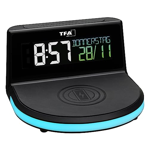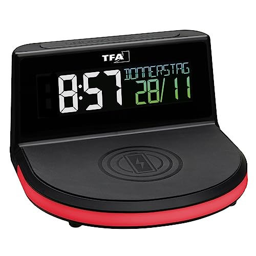 TFA Dostmann Charge-IT Sveglia Digitale, 60.2028.01, con Funzione di Ricarica Wireless (Qi), Data, Temperatura Ambiente, con Luce dell'ambiente, Nero