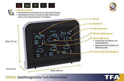 TFA Dostmann Nimbus Stazione meteo per interni ed esterni con sensore esterno, previsioni di 4 giorni di meteorologen, Umidità dell'aria, con orologio radiocontrollato