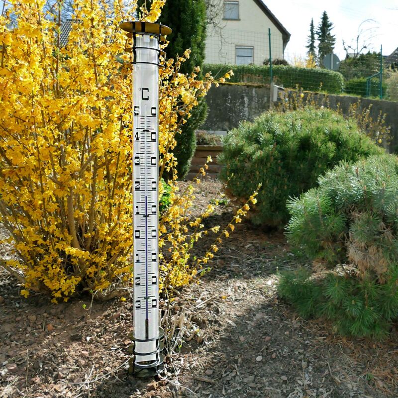 Termometro da giardino, resistente agli agenti atmosferici Per misurare la temperatura esterna. Grazie alla ripartizione stampata in maniera ben leggibile, la temperatura può essere letta anche a grande distanza. Parte superiore e inferiore in metallo laccato nero Tubo in Plexiglas Con bastone da terra Misura da -30 a +50°C Altezza: ca. 110 cm