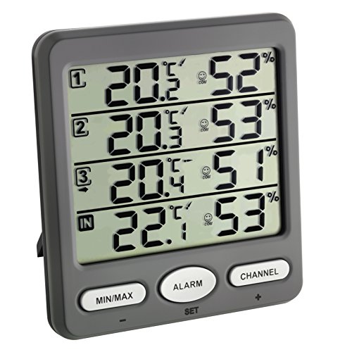 TFA Dostmann Termo-igrometro Digitale radiocontrollato Klima-Monitor, 30.3054.10, con 3 sensori Esterno, Temperatura e umidità, Clima Ambientale, valori di Allarme, Grigio