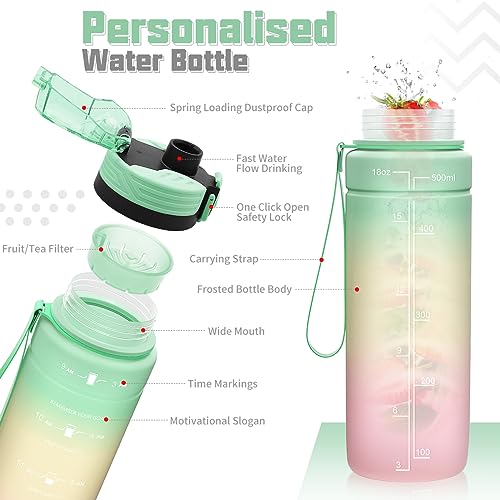 【Design colorato ed elegante】 La bottiglia d'acqua a prova di perdite è la combinazione di colori sfumati più alla moda dei designer combinati con i vari colori popolari dei tempi moderni, progettati per l'uso quotidiano, questa bottiglia d'acqua non è solo bella fuori leggera, ma anche durevole per il fitness, il ciclismo, l'escursionismo o il campeggio tutte le attività indoor e outdoor