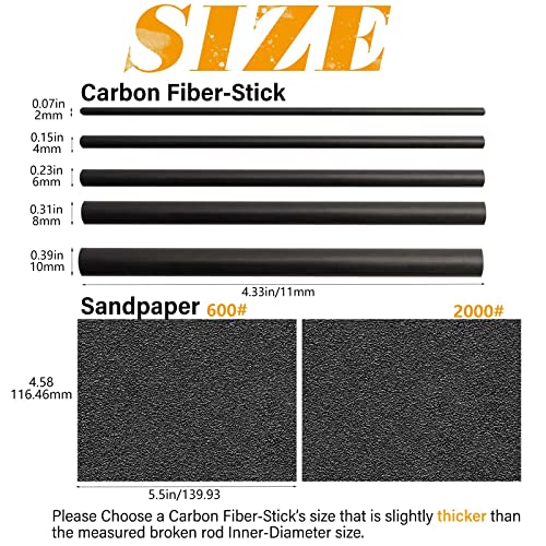CINQUE DIVERSE DIMENSIONI DA SCEGLIERE: 2mm/0,07in 4mm/0,15in, 6mm/0,23in, 8mm/0,31in, 10mm/0,39in. Si prega di misurare il diametro interno dell'asta rotta per scegliere la misura giusta prima di ordinare. Scegliere una misura di stick in fibra di carbonio leggermente più spessa della misura del diametro interno dell'asta rotta.