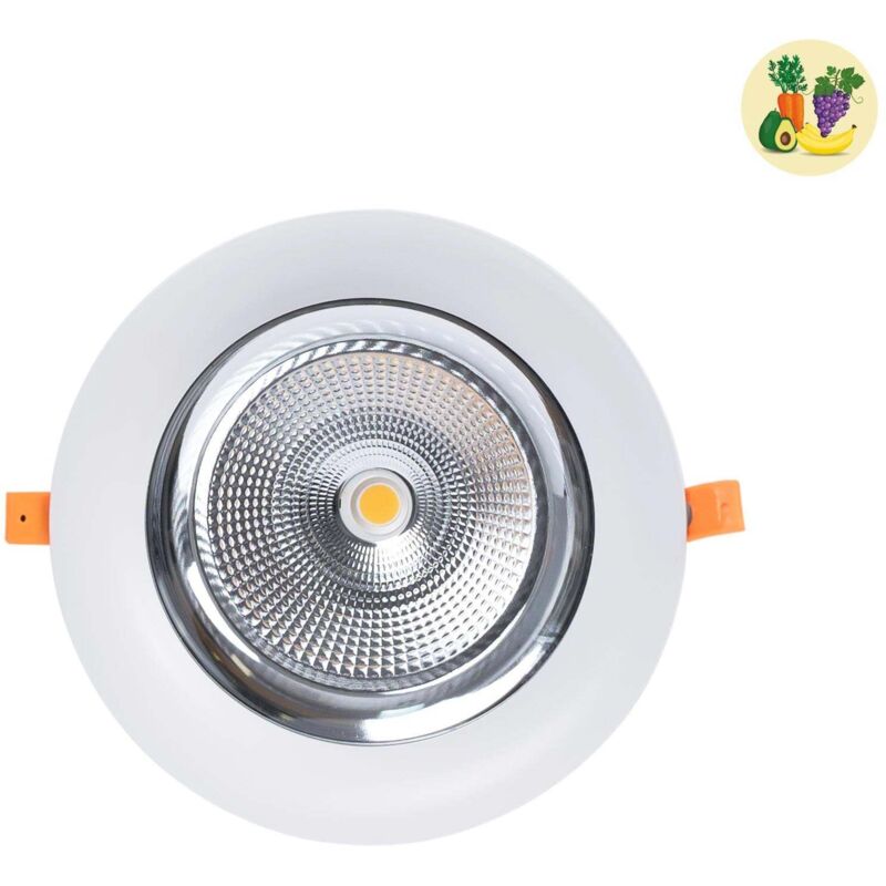 Downlight LED specifico per negozi di frutta e verdura. È dotato di un chip R00VA19 che garantisce un'illuminazione di altissima qualità, con un eccezionale indice di resa cromatica (CRI=97). Produce una luce caratteristica che mette in risalto il colore di verdure e ortaggi, conferendo loro un aspetto fresco e favorendo così la decisione di acquisto del cliente. Diametro esterno: 225 mm Diametro del taglio: 210 mm