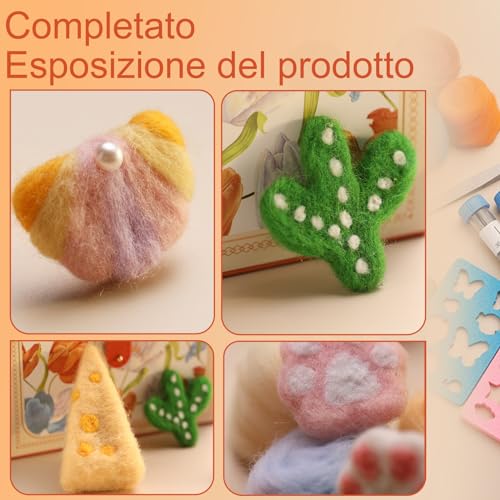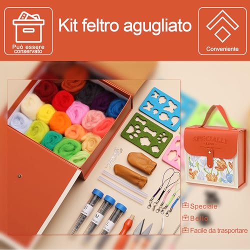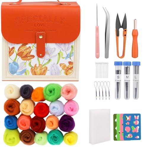 Kit per feltro ad ago: la confezione include 20 colori di stoppino di lana, 30 aghi (dimensioni piccole, medie e grosse), 30 occhi elastici, 10 aghi argento a forma di 9, 5 catene di corda colorate, 4 piccoli stampi in feltro di lana, 1 manico in legno colorato., 1 paio di guanti per le dita, 1 pinzetta, 1 tagliafilo, flacone con 3 aghi, 1 tampone in schiuma, 2 stick di colla, 1 punteruolo, 1 confezione regalo arancione portatile.