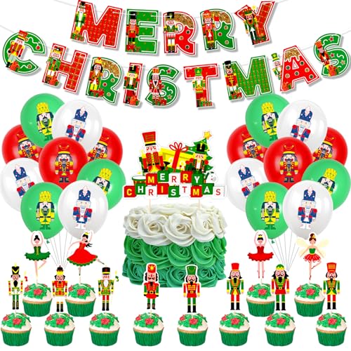 DPKOW 32pcs Decorazioni di Natale Striscioni Palloncini Torta Topper, Natale Ghirlanda Striscione Schiaccianoci Soldato Palloncini Topper per Cupcake Natale Feste Decorazioni Torte Natale Christmas