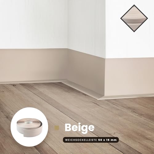 DQ-PP Listello morbido | 100 m (4 x 25 m) | beige | 50 x 15 mm | PVC | autoadesivo | angolo di piegatura per battiscopa in gomma | listello angolare