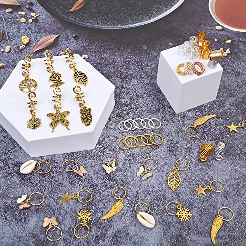 Cosa ottieni: otterrai 350 pezzi dreadlocks gioielli di mix styles treccia gioielli con una scatola di immagazzinaggio trasparente. Include 6 ciondoli per capelli in metallo oro antico (farfalla, rosa, foglia, gufo, neve, albero della vita), 100 polsini in metallo nei colori oro e argento, 30 ciondoli pendenti fai-da-te,20 molle intrecciate, 54 anelli in oro e argento per capelli e 140 Curve Circle.