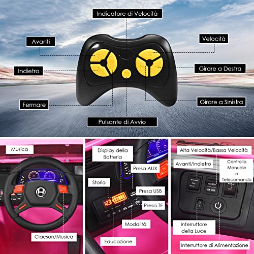 Esperienza di Guida Realistica - Questa macchina elettrica per bambini offre un'esperienza di guida realistica. Il volante è comodo da girare per andare nella direzione che si vuole. Il cruscotto luminoso ha la velocità indicata e vari pulsanti per la musica, le luci, la retromarcia, il volume ed eccetera.