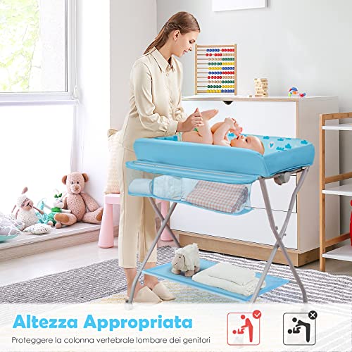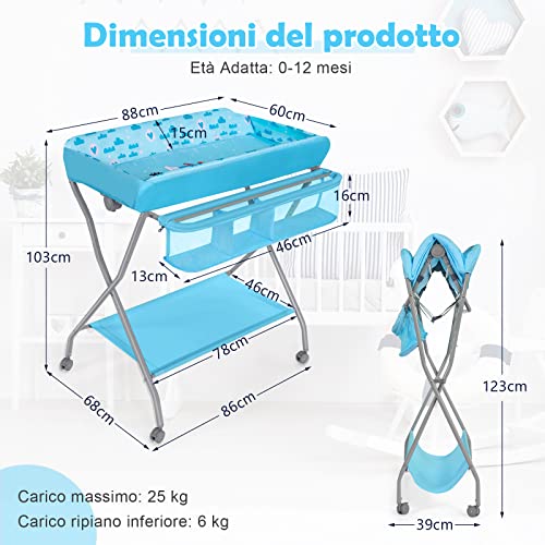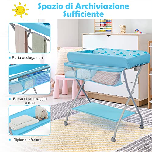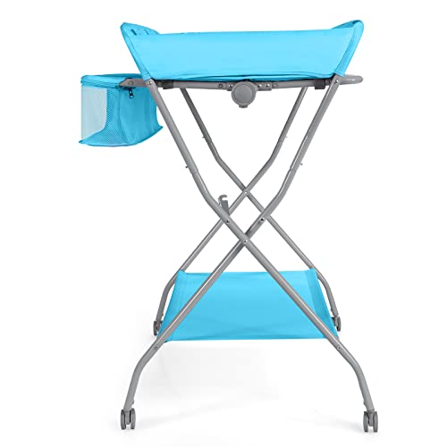 DREAMADE Fasciatoio Pieghevole per Neonati 0-12 Mesi, Carico 25kg, con Rotelle Girevoli a 360°, con Cesto e Mensola di Stoccaggio Comodi, Struttura in Metallo Robusta, 86 x 68 x 103 cm (Blu)