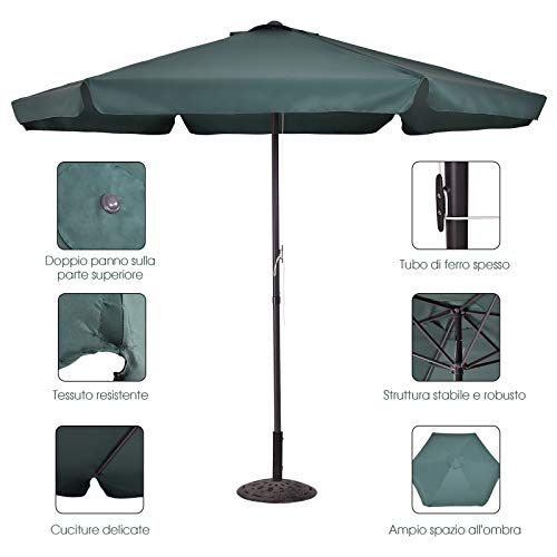 Dimensioni Ombrellone - Diametro: 300 cm. Altezza: 240 cm. Diametro del palo: 38 mm. Numero di costole: 6. Materiale del palo: ferro. Materiale del panno: poliestere. Colori disponibili: beige, marrone e verde. Se hai domande pre-vendita o post-vendita, ti preghiamo di contattarci, ti risponderemo entro 24 ore lavorative.
