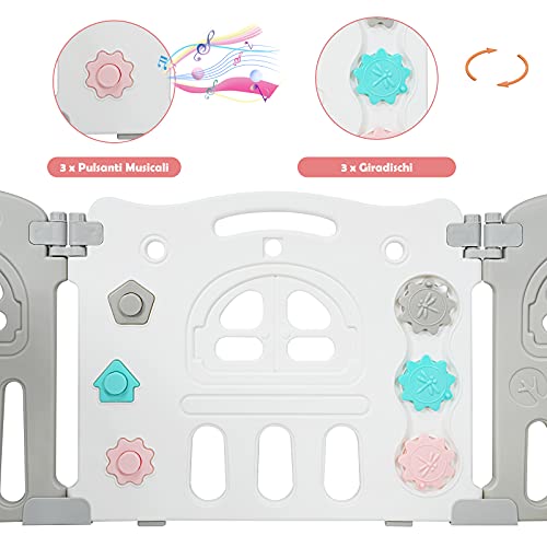 Centro di Attività per Gioco - Tra i 10/14 pannelli, ce n'è uno per giocare che è dotato di 3 pulsanti che emetteranno i suoni con una leggera pressione e 3 giradischi. Questi piccoli giocattoli sono fantastici per attirare l'attenzione del tuo bambino. Puoi metterli in sicurezza nel recinto e fare i tuoi affari.