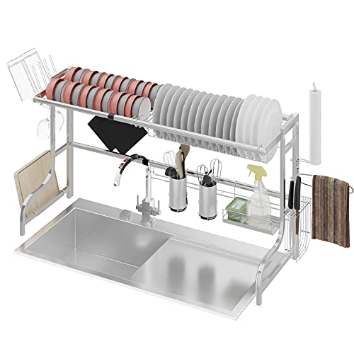 DREAMADE Scolapiatti da Appoggio per Lavello, Scolapiatti in Acciaio Inossidabile, Scolapiatti Grande ed Estensibile, con Portabicchieri, Portapiatti, Portacoltelli, Porta tagliere e Ganci