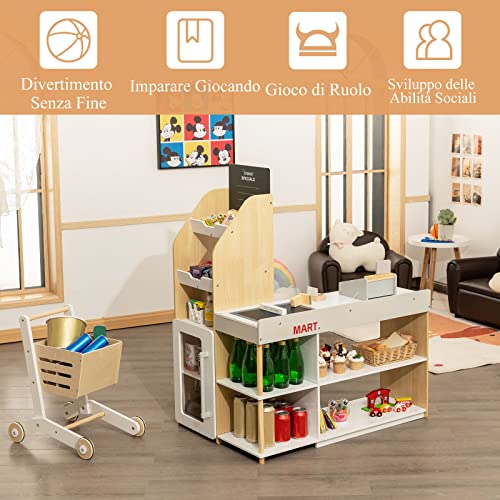 DREAMADE Supermercato Giocattolo per Bambini, Carrello della Spesa Giocattolo, Cassa Giocattolo con i Accessori, 90 x 62 x 111 cm (Cassa), 46,5 x 35 x 53 cm (Carrello della Spesa)