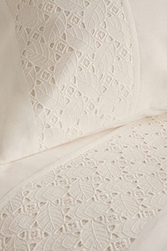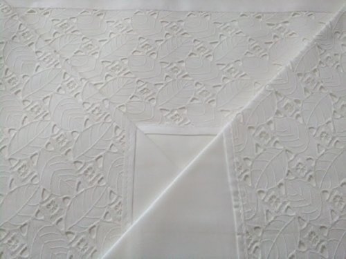 Il ritorno del pizzo sangallo, con i suoi tipici motivi traforati eseguito a rilievo a cordoncino, in una moderna gradevolissima realizzazione. La balza di pizzo è applicata sul bordo e su un lato delle federe.