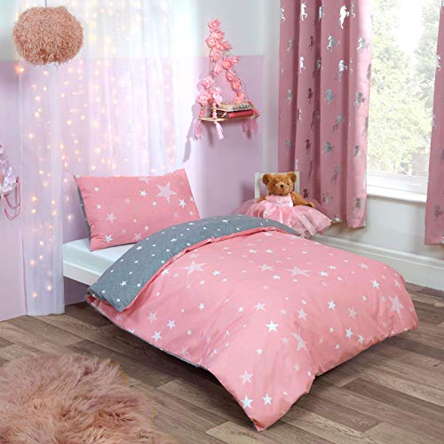 Dreamscene Galaxy Stars-Set Copripiumino Reversibile con Federa, Motivo: Stelle, Policotone Poliestere 50% Cotone, Rosa e Grigio, Junior/COT