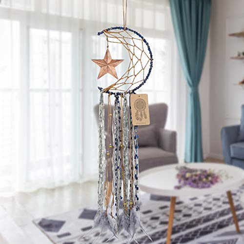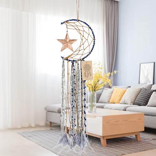 Dremisland Blu Acchiappasogni Blu Handmade Half Circle Luna Stella Design con Piume Dreamcatcher Appeso a Parete Decorazione della casa Ornamento Festival di Natale Regalo Artigianale