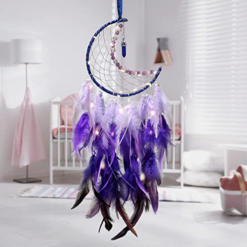 Dremisland Acchiappasogni Luna con Lucine Fatte a Mano con Colorate Piume Ciondolo Turchese Dream Catcher Appendere a Parete per Bambini Decorazione da Parete Camera da Letto di Casa (Puro viola)