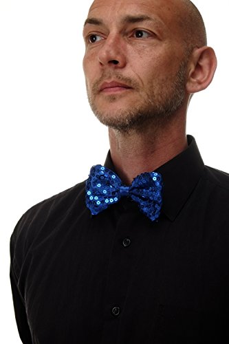 Papillon blu con paillettes e fascetta elastica, per cabaret, varietà, clown o direttore di circo. 100% poliestere. Codice colore: blue. Circonferenza: 28-60 (fascetta elastica). Larghezza: 12 cm.