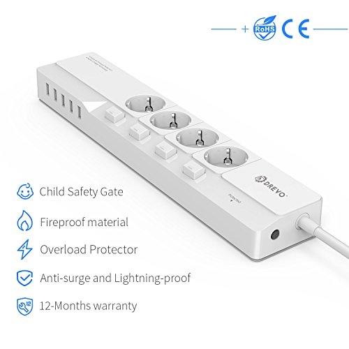 DREVO DP45 Multiprese Ciabatte elettriche con 5 Porte USB 4 Prese EU Caricatore con Interruttore Cavo 1.5m Bianco
