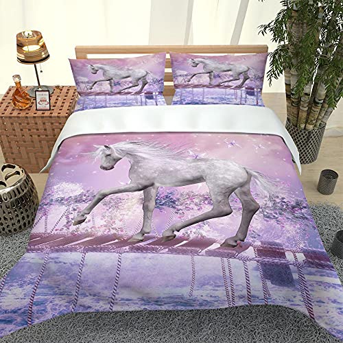 DRFQSK Set Copripiumino Una Piazza E Mezza Bambini Bambina Ragazza Stampati in Fiori Viola Animale Cavallo 3D Biancheria da Letto Una Piazza E Mezzo Copripiumini 1 Piazza E Mezzo 200X200Cm con 2 Fede