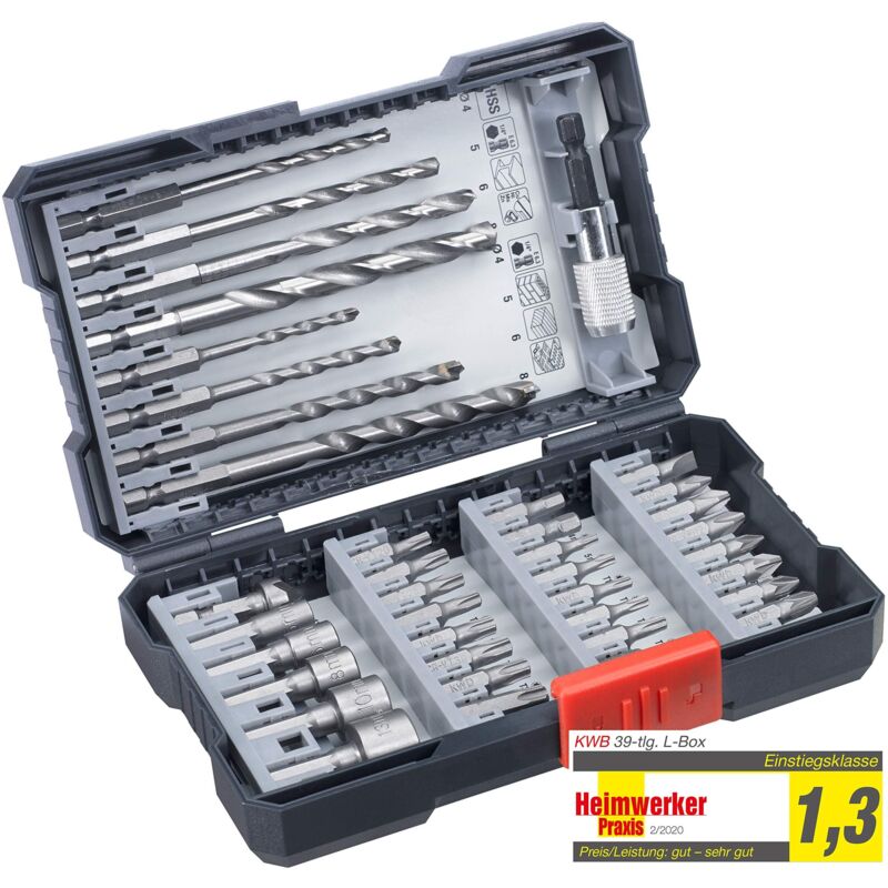 Inserti di prese per dadi avvitabili, svasatura per lavare a filo di viti, tutti i bit e per esercizi adatti per perforatrici disponibili in commercio e cacciaviti cordless, impostati in l-box.