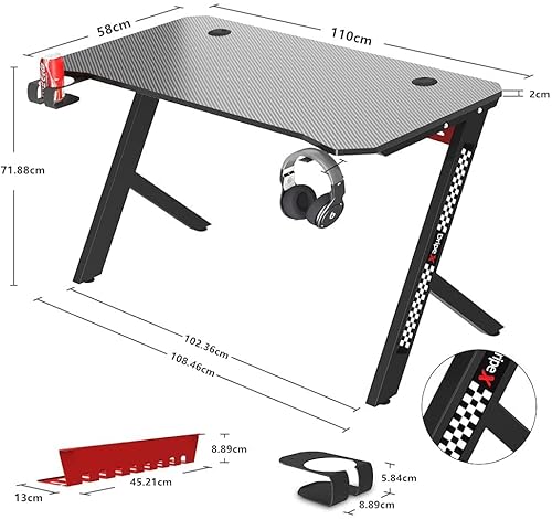 Dripex Scrivania Gaming, Scrivania da Gioco Ergonomica, Tavolo per PC a Forma di R con Gestione dei Cavi, Portabicchieri e Gancio per Cuffie 110x60x73 cm Nero