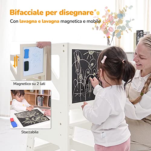 Learning tower con Lavagna:I tuoi bambini piccoli possono esprimere le proprie idee nei disegni, esercitarsi nelle lettere e nell'aritmetica attraverso scarabocchi. Ciò incentiva un rapporto di complicità e fiducia con il genitore, dato dalla condivisione di tante esperienze insieme.