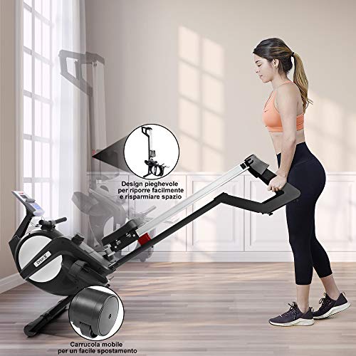 【Design Ergonomico】Una comoda sella e braccioli antiscivolo garantiscono la migliore postura di seduta durante la voga. Il poggiapiedi è dotato di un cinturino in velcro per fissare perfettamente i tuoi piedi. Dotato di sistema di trazione silenzioso e display LDC (tempo, viaggio al minuto, viaggio totale, viaggio per allenamento, calorie, SCAN.), Puoi monitorare il tuo allenamento