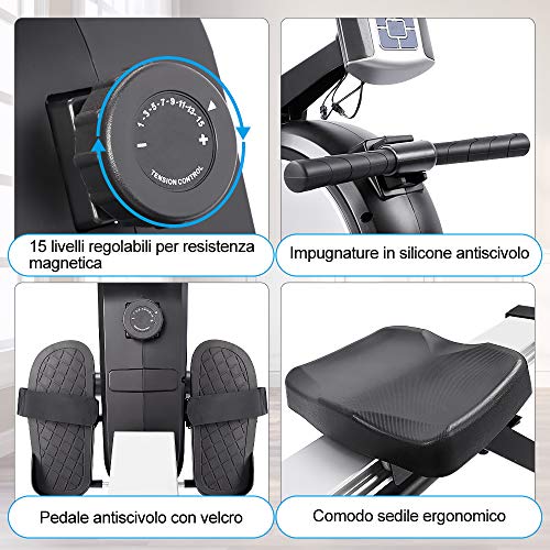 Dripex Vogatore Pieghevole per Casa, Vogatore Magnetico Regolabile con 15 Livelli di Resistenza, Doppia Guida di Scorrimento in Alluminio, Vogatore da Fitness per Cardio e Allenamento della Forza