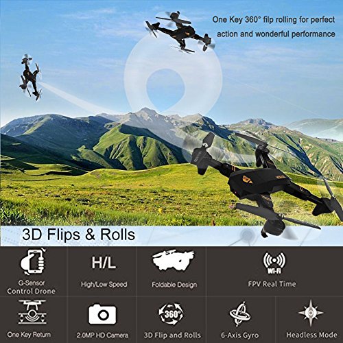 MKT - Drone FPV pieghevole telecomandato, quadrirotore, comando tramite app per smartphone, antenna 2,4 GHz a 4 canali e giroscopio a 6 assi, modalità altitudine costante, Headless, Waypoints