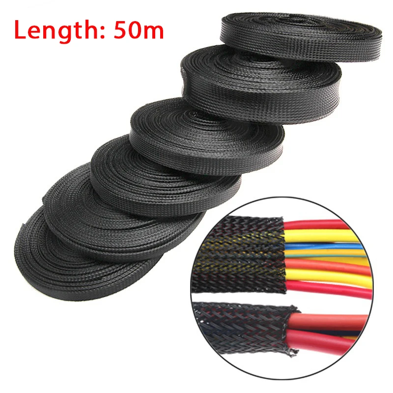 Dropship 50M Black Insulated Braid Sleeving 2/4/6/8/10/12/15/20/25mm Tight PET Wire Cable Gland Protection Cable Sleeve