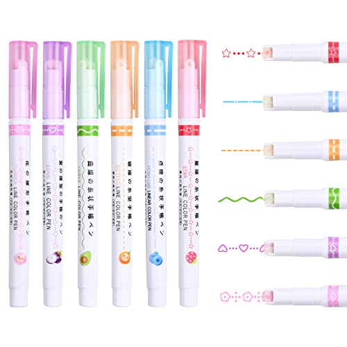 Drwosm 6 Pzi Penna Evidenziatore Curva Colorate Highlighters Penna Contorno Cuore/Fiore/Ondulato/Punteggiato/Rotto/Punto Linea Evidenziatore Marcatori per Segnare Scrapbook Scarabocchiare(B)