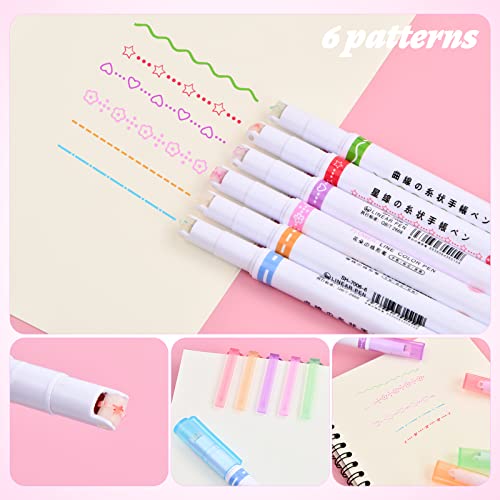 【Set di penna evidenziatori curvi】:ha sei diversi tipi di penne fluorescenti, tra cui linea di punti, linea tratteggiata, linea curva, fiore, stella e amore, con varie scelte per soddisfare le tue esigenze di pittura e scrapbook fai-da-te.