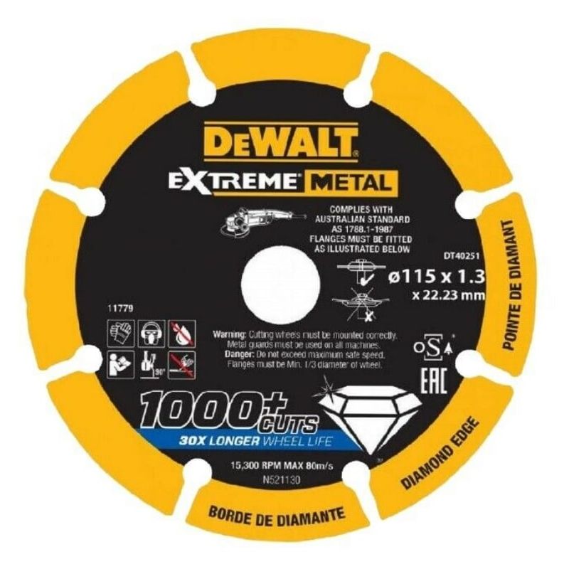 DEWALT DT40251 Disco Extreme Diamond diamantato per taglio metalli diametro 115 mm con durata e prestazioni estreme per oltre 1000 tagli. CARATTERISTICHE - 1000+ tagli: il Disco Extreme Diamond � realizzato con diamante che taglia il metallo ed � legato alla superficie del disco con una nuova tecnologia;