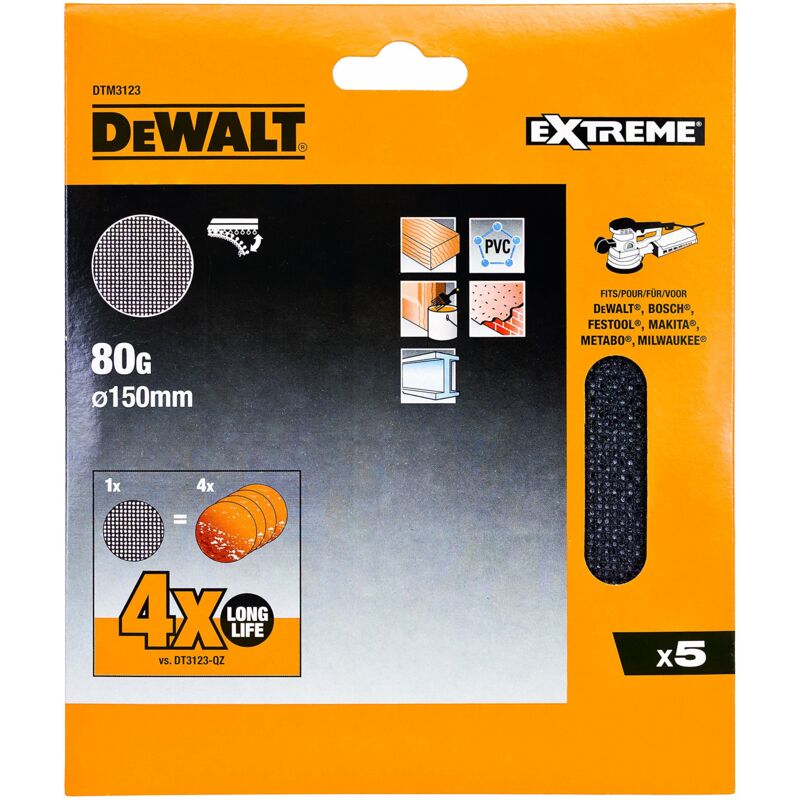 The DTM3123 Mesh Sanding Discs have the following specifications:Size: 150mm.Grit: 80.