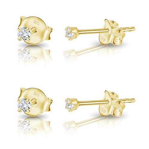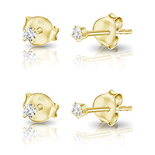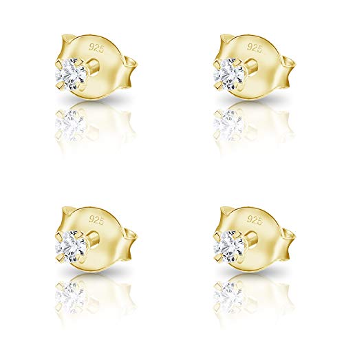 DTPsilver - 2 Paia di Orecchini a Perno Molto PICCOLI - Argento 925 Placcato in Oro Giallo con Zirconia Cubica Rotondi - Diametro 2 mm - Colore: Chiaro/Bianco CZ